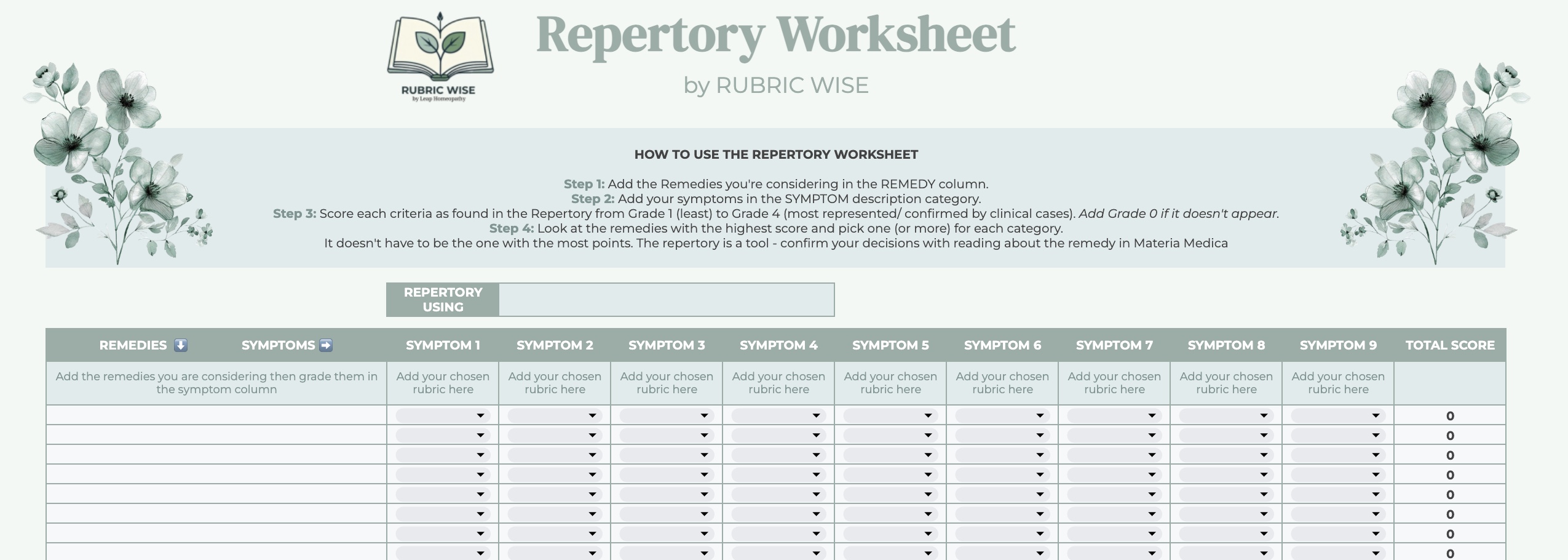 Inside this customizable Google Worksheet you will be able to save time on your manual repertorization, keep your repertory grading clean, and help you build confidence with every case.